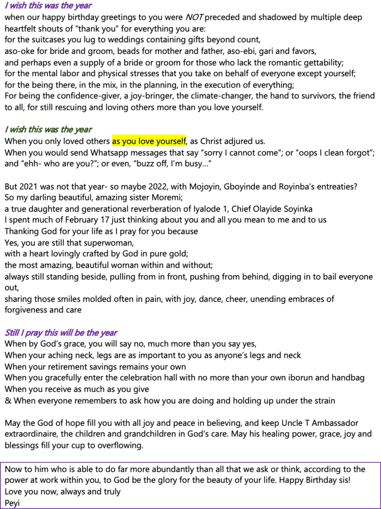 A professor of politics at Ithaca College NY, a minister at Cornerstone Christian Fellowship, an advocate for embattled women and children, and for victims of abuse and injustice. I'm honored to lead Verity CNet working alongside women of faith, to serve on the Tompkins County Human Rights Commission, and on the teaching team of another local church in Ithaca. I'm blessed to walk alongside Aloja, my forever life partner for 30 plus years now, and together to journey through life with our riotous clan of three plus one: Olutale and Connor, Oseoba and Yolore. Catch me dancing down the streets at midnight to Sinach, Phil Driscoll, and other amazing artistes. View all posts by Peyi Soyinka-Airewele